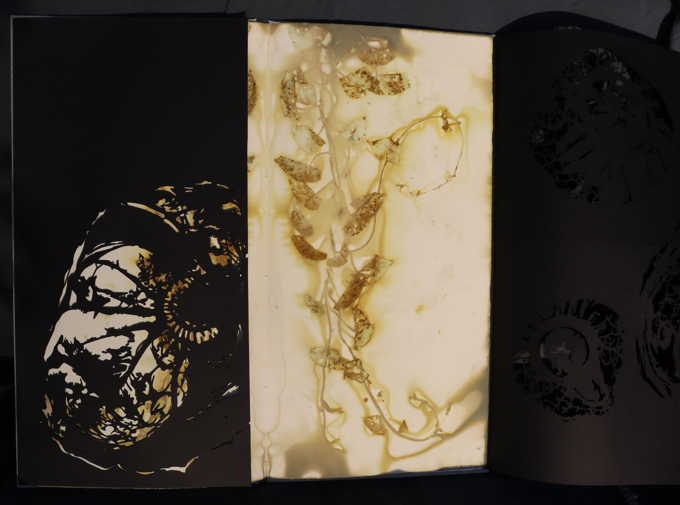 Zwei Flügel-Scherenschnitte sind seitlich im Deckel befestigt und können auf- und zu geklappt werden. Sie zeigen fiktive Urtierchen oder Einzeller,..., Getaltung von Stephan Flommersfeld |