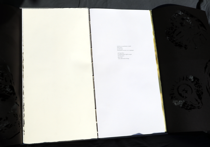 Gemeinschaftsproduktion von drei Unikatbüchern zu einem Konzept Format: 30 x 59 cm Seitenzahl: 8 Entstehung: 2025/26 Hardcover/ hellgrauer Leinenbezug mit Intarsienschiefer